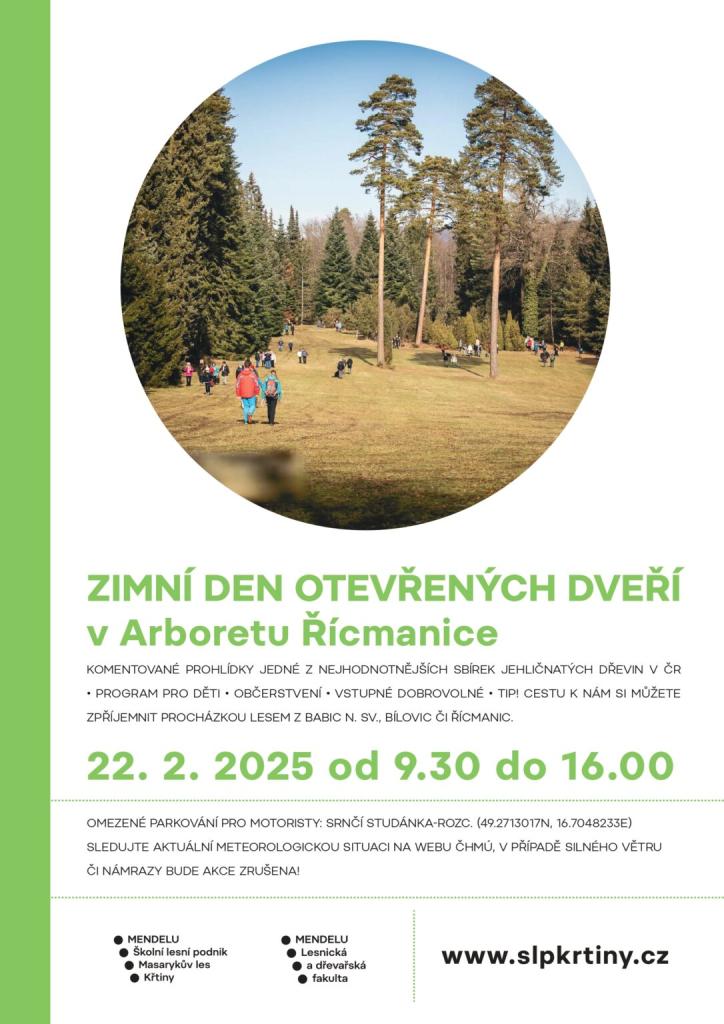 Den otevřených dveří arboreta Řícmanice - komentované prohlídky jedné z nejhodnotnějších sbírek jehličnatých dřevin v České republice. Akce nabízí program pro děti i malé občerstvení. Vstupné dobrovolné. V případě nepřízně počasí se akce ruší.