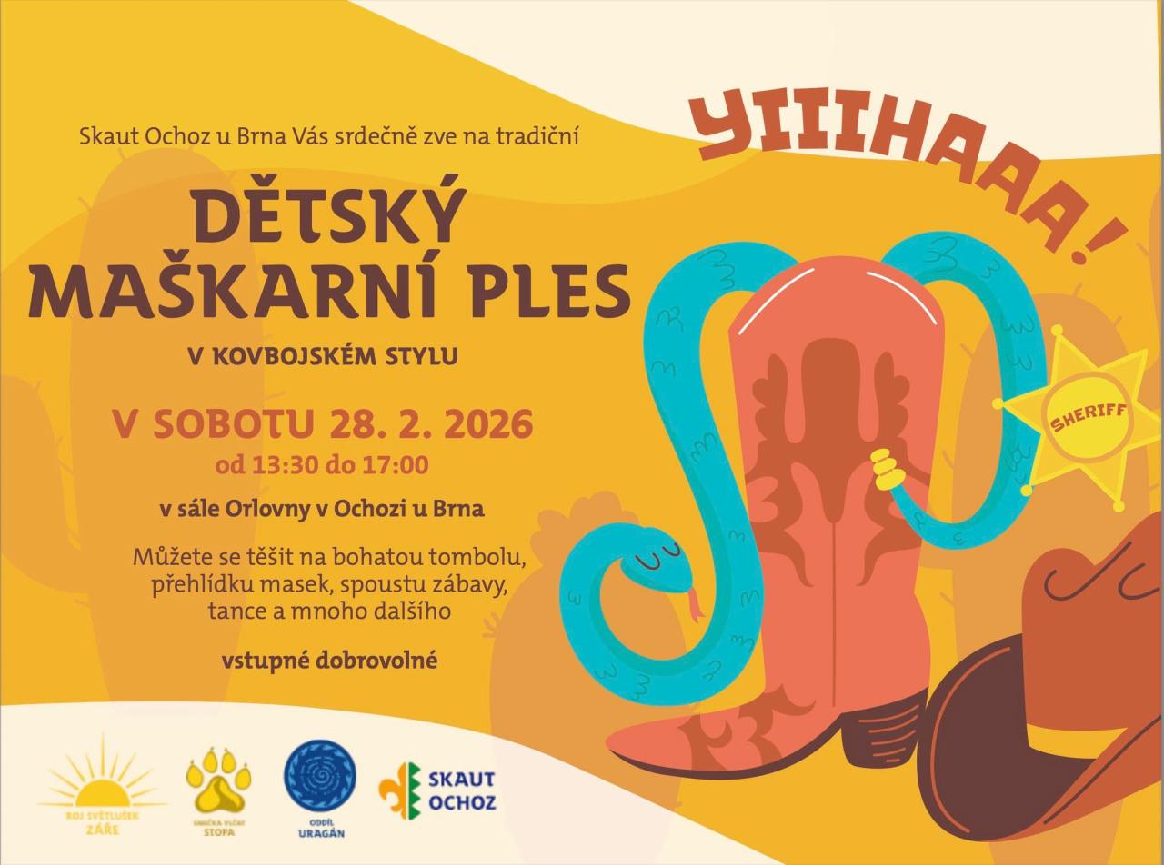 Skaut Ochoz u Brna Vás srdečně zve na tradiční dětský maškarní ples v kovbojském stylu. Akce se uskuteční v sobotu 28. února 2026 od 13:30 do 17:00 v sále Orlovny v Ochozi u Brna.