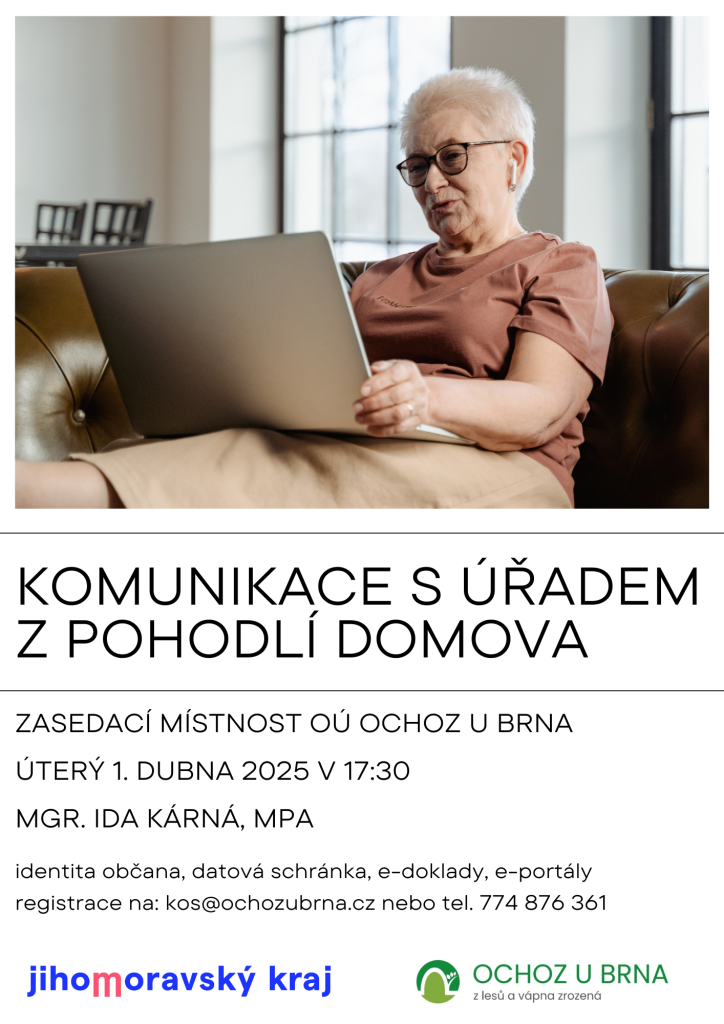 Srdečně zveme na seminář věnující se digitální komunikaci s úřady dne 1. dubna 2025 v 17:30 do zasedací místnosti OÚ Ochoz u Brna. Blíže se seznámíte s identitou občana, datovou schránkou, e-doklady a e-portály. Přihlášení na: kos@ochozubrna.cz /tel. 774 876 361. Počet míst omezen. Seminář je zdarma. Akce se koná za finanční podpory Jihomoravského kraje.