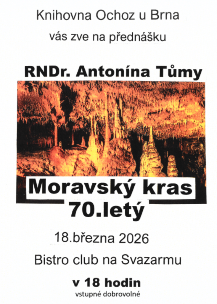 CHKO Moravský kras letos slaví 70 let, ku příležitosti tohoto krásného výročí se koná 18. března 2026 v 18:00 v Bistro clubu na Svazarmu přednášku RNDr. Antonína Tůmy o Moravském krasu.