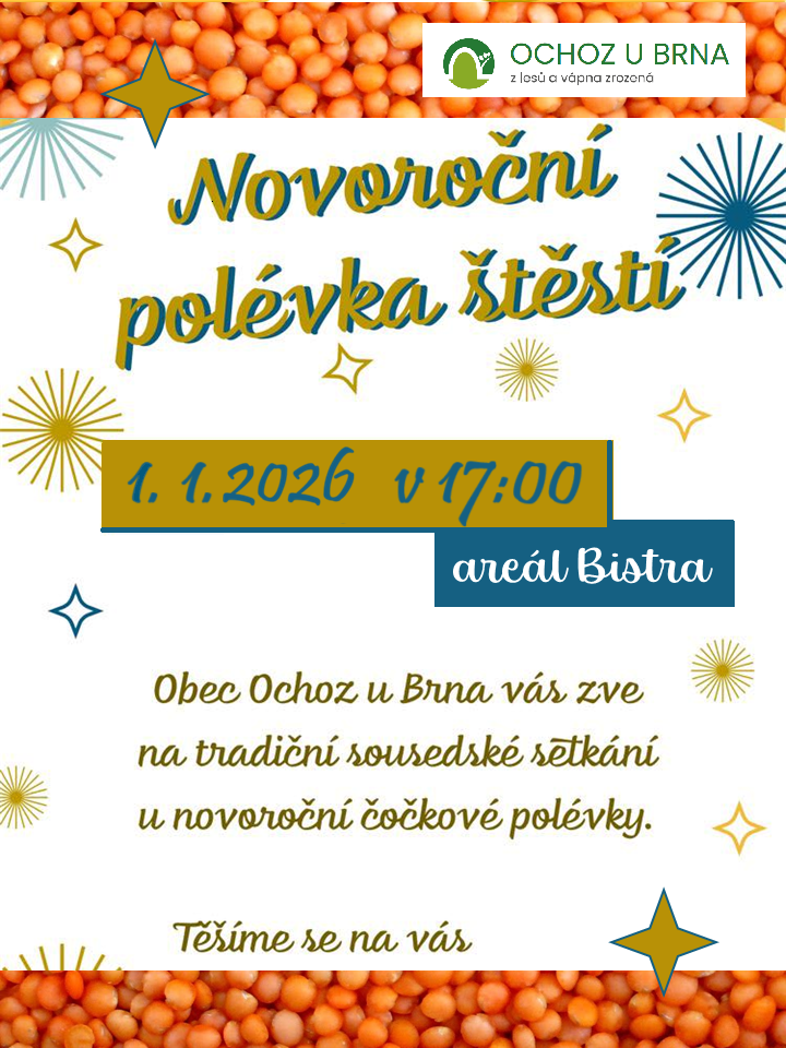 Srdečně Vás zveme na tradiční sousedské setkání u novoroční čočkové polévky, které se uskuteční 1. ledna 2026 od 17:00 na Bistru. Těšíme se na Vás.