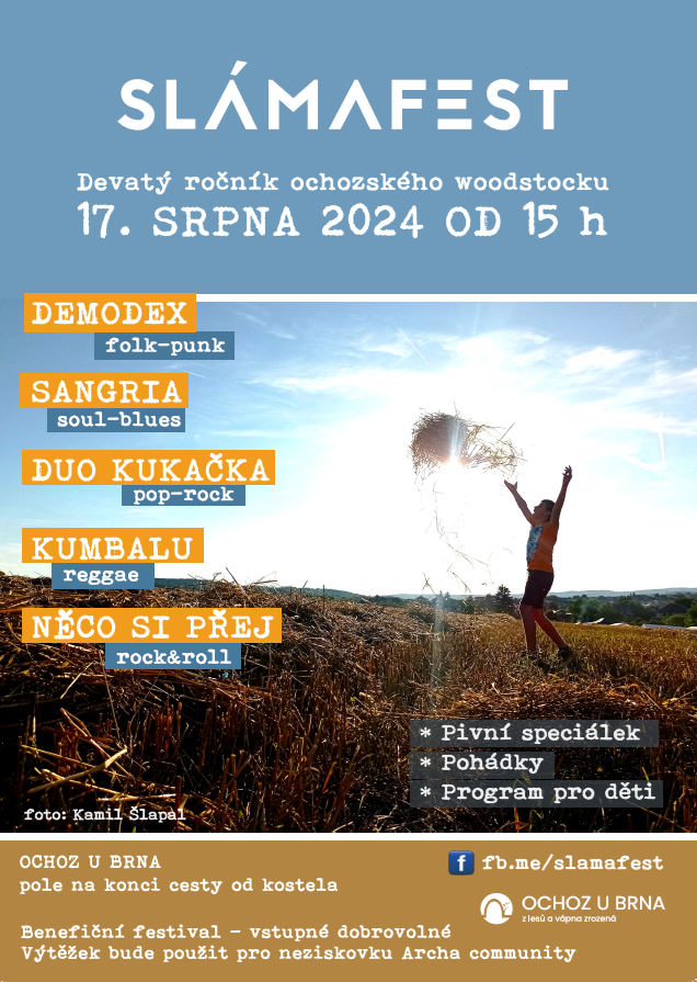 Nenechte si ujít další ročník "Ochozského Woodstocku" 17. srpna 2024 na poli (pokračování ul. Za Kostelem, Ochoz u Brna). Bližší informace se brzy dozvíte.
