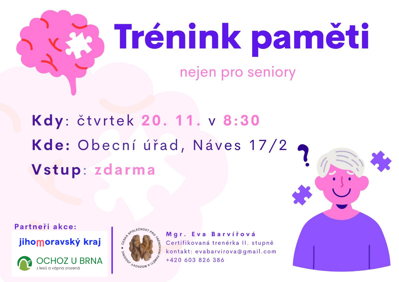 Zveme vás na trénink paměti, který se koná ve čtvrtek 20. listopadu 2025 od 8:30 hodin. Tato akce je určena nejen pro seniory, ale pro každého, kdo se chce zlepšit v paměti a kognitivních schopnostech. Setkání se uskuteční na Obecním úřadě. Vstup je zdarma, těšit se můžete I na drobné občerstvení.
