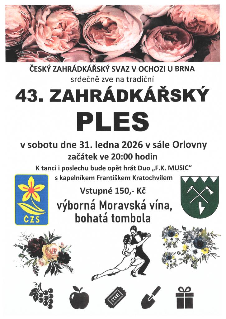 Český zahrádkářský svaz v Ochozi u Brna srdečně zve na tradiční 43. zahrádkářský ples. Akce se uskuteční v sobotu 31. ledna 2026 v sále Orlovny, kde se můžete těšit na večer plný tance a hudby. K tanci i poslechu zahraje Duo „F.K. MUSIC“, vedené kapelníkem Františkem Kratochvílem. Vstupné na tuto jedinečnou událost činí 150 Kč.